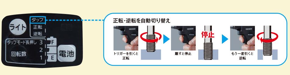 ●負荷の軽い時は回転数を上げスピードアップ。負荷が大きくなると最適なタイミングでトルクを出す方向へ自動でシフト。作業に最適な回転数・トルクでスピーディな作業を実現。